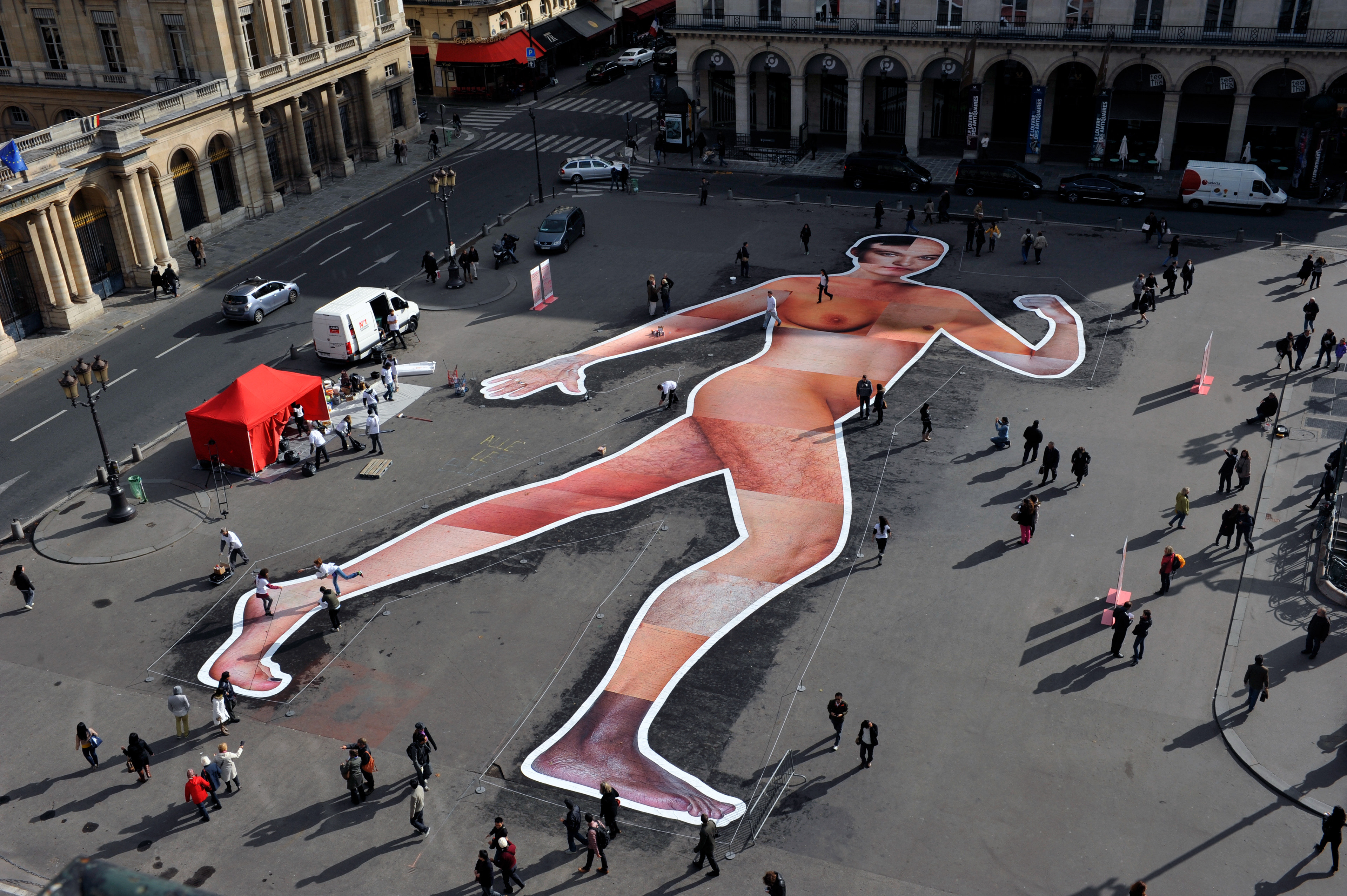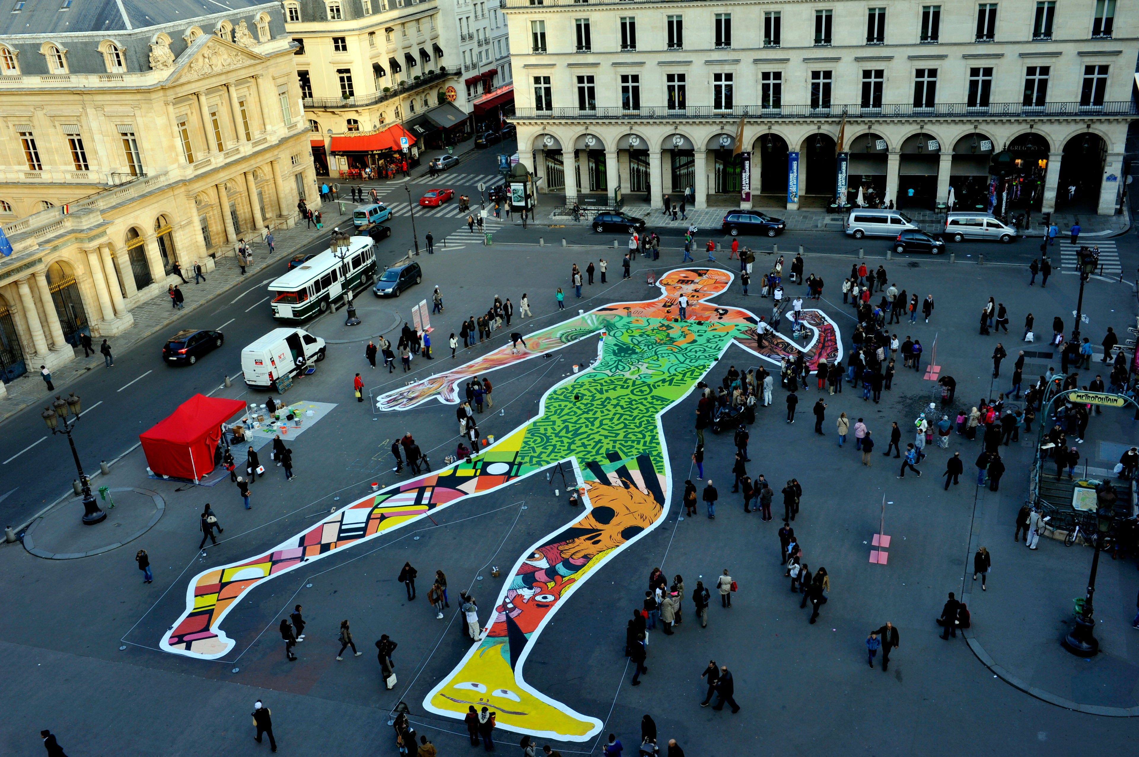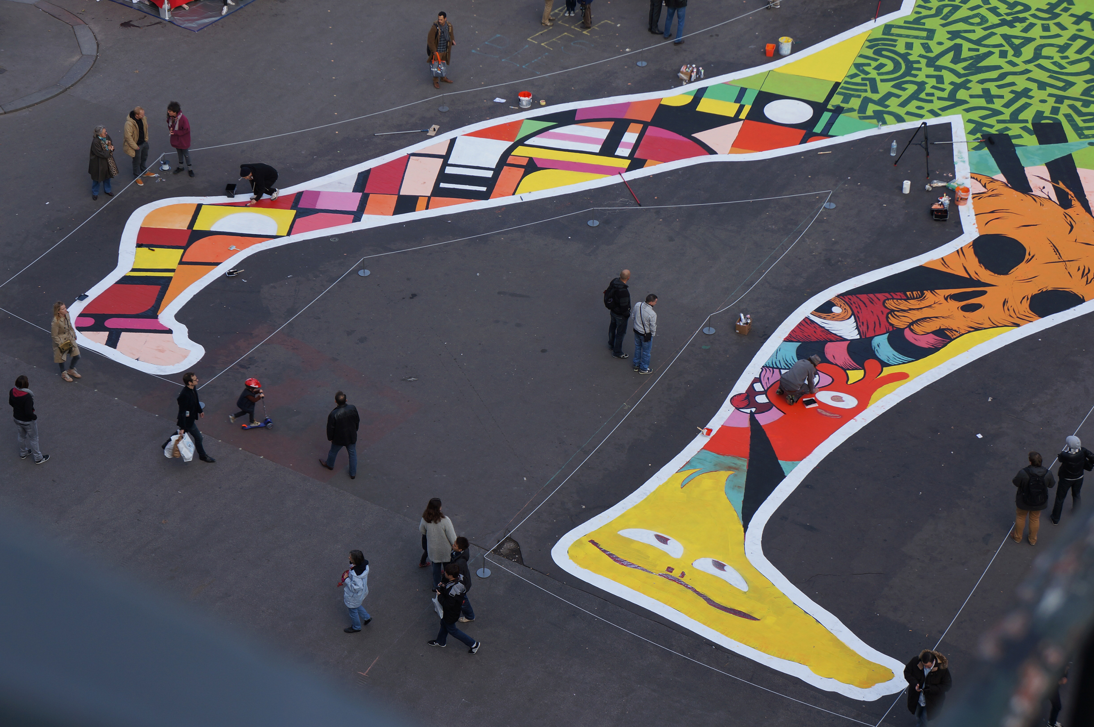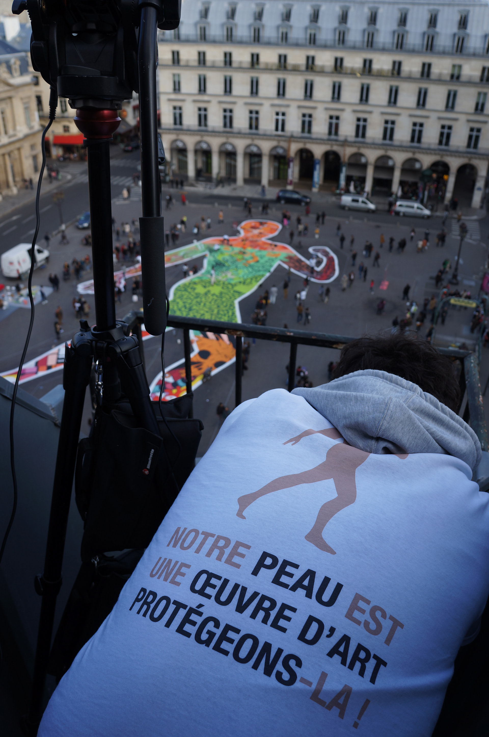 As part of a health prevention action to raise public awareness of an unknown skin disease, a giant figure stuck to the ground from 25 photographs of skin pieces was imagined and made on the Palais Royal Place in Paris. This human body of 750m2 was then customized by 7 street artists according to a chromatic code to create an artistic cartography of the sensitive areas related to the disease.