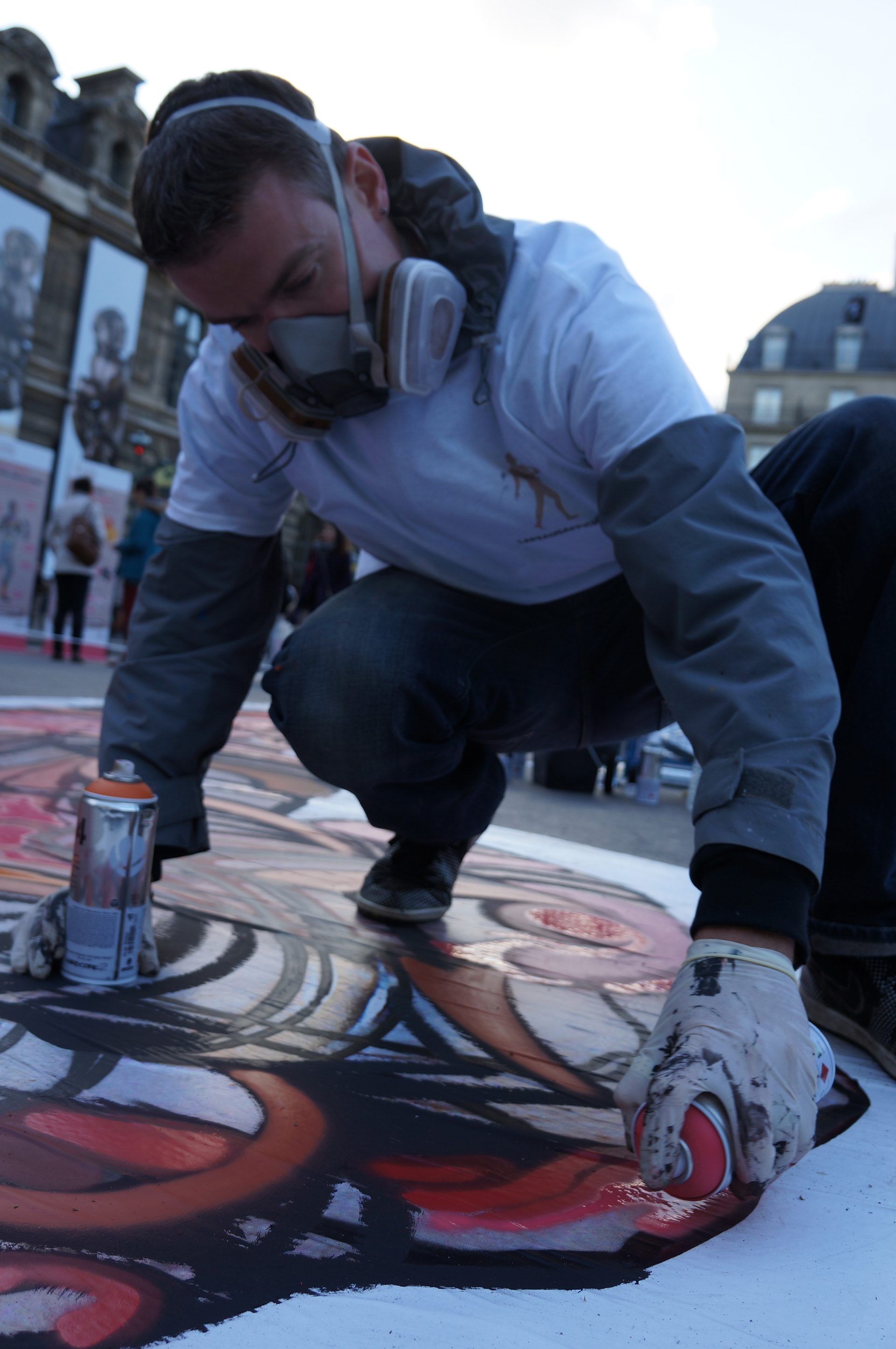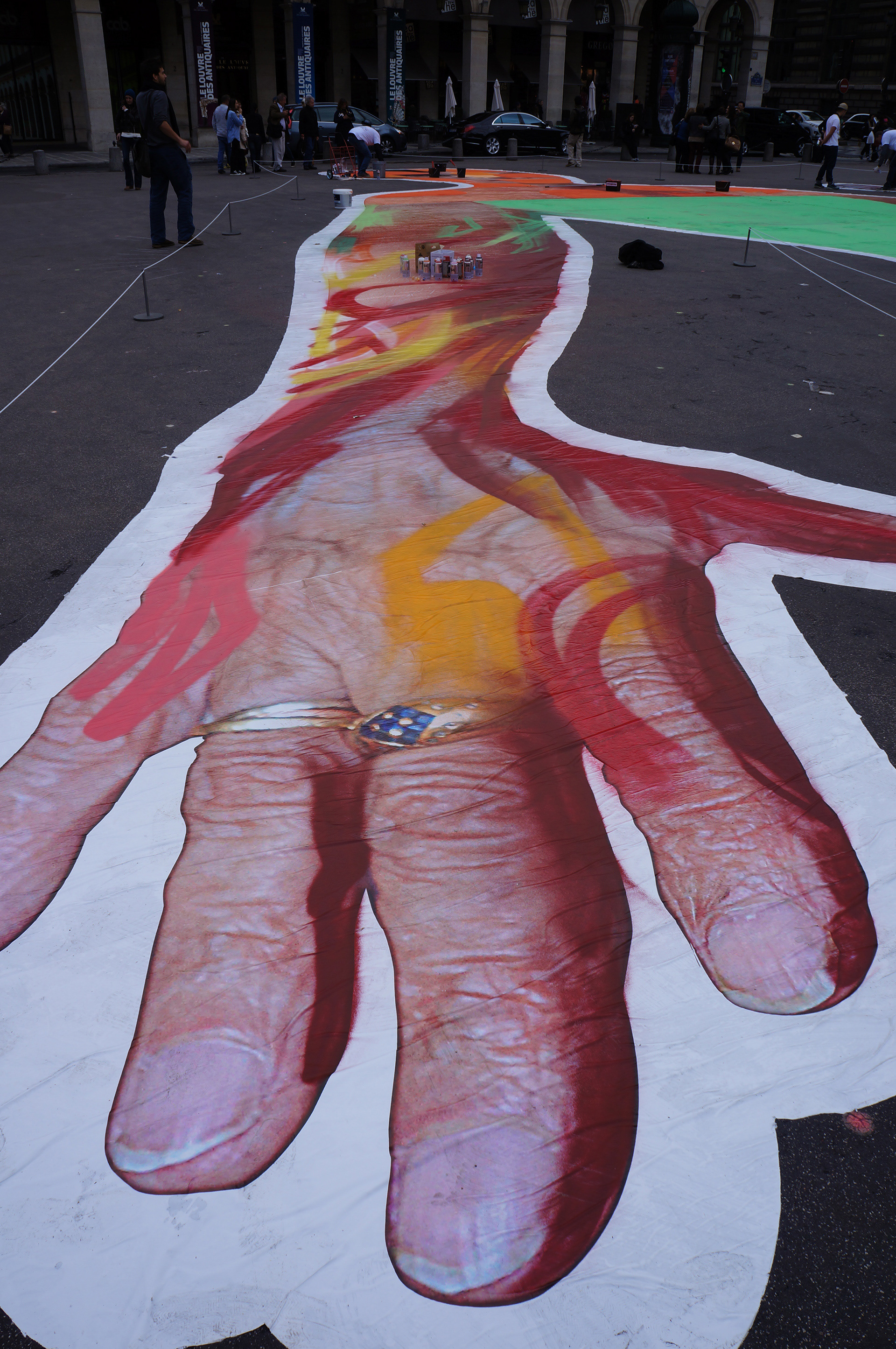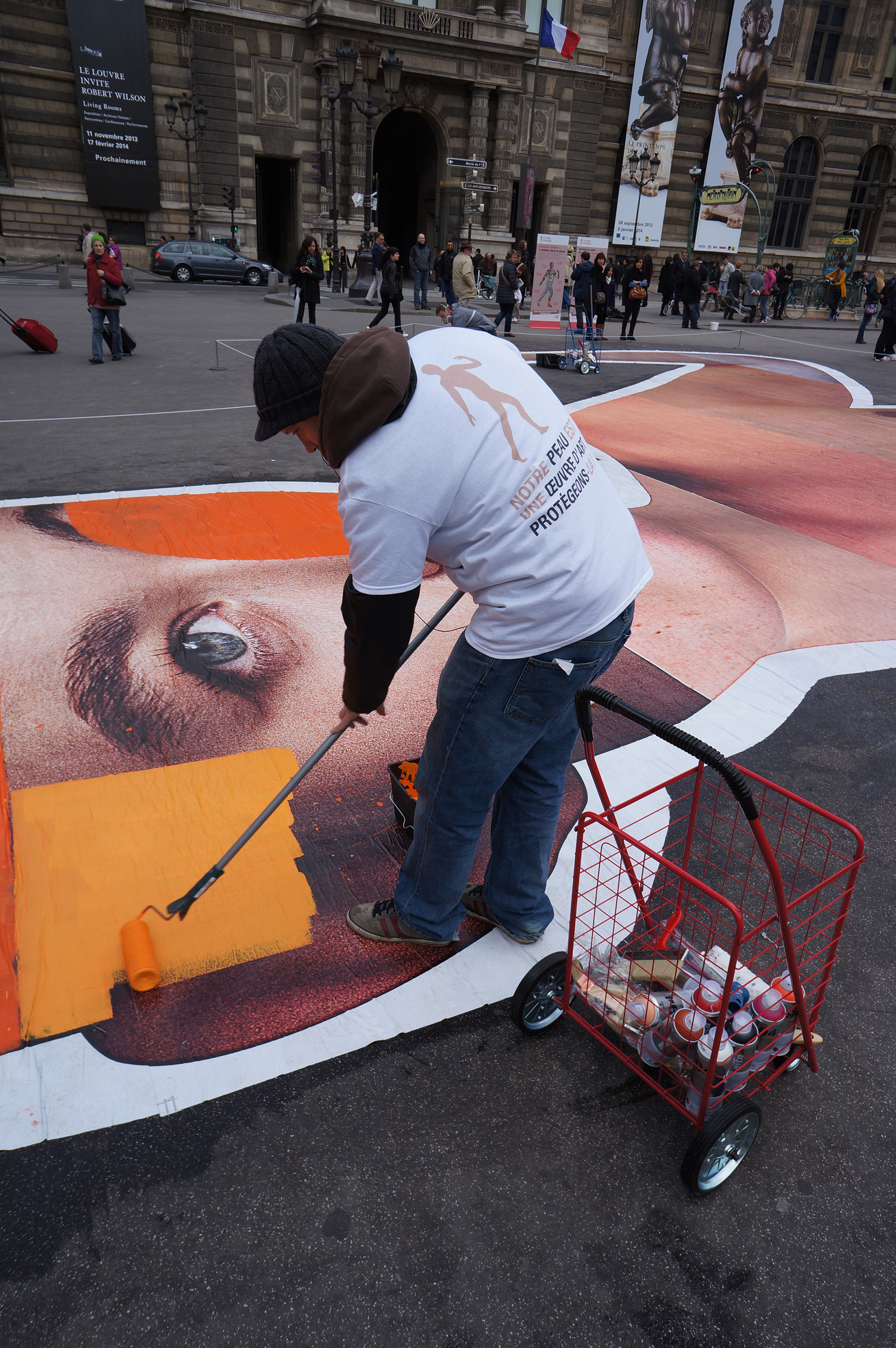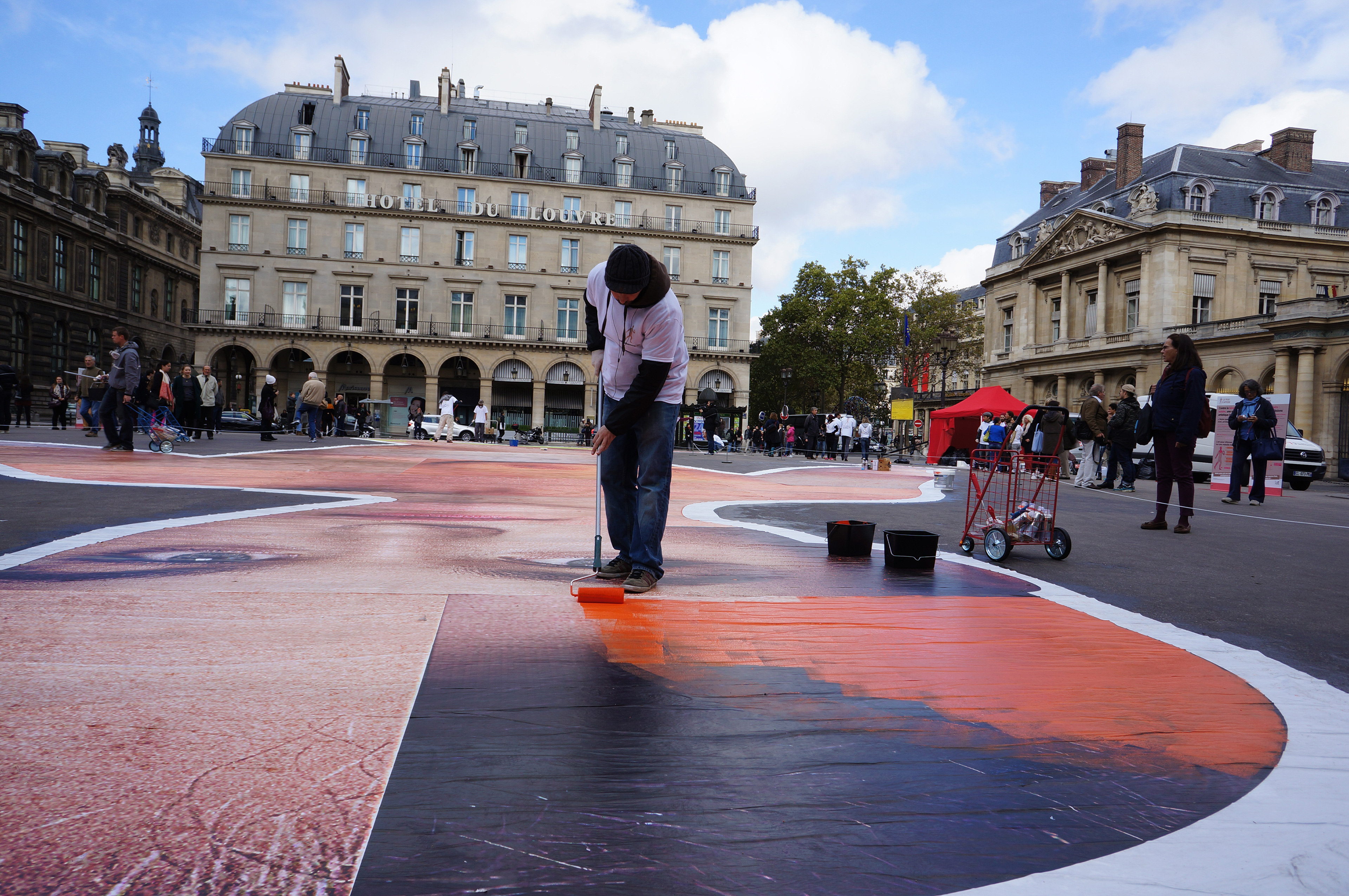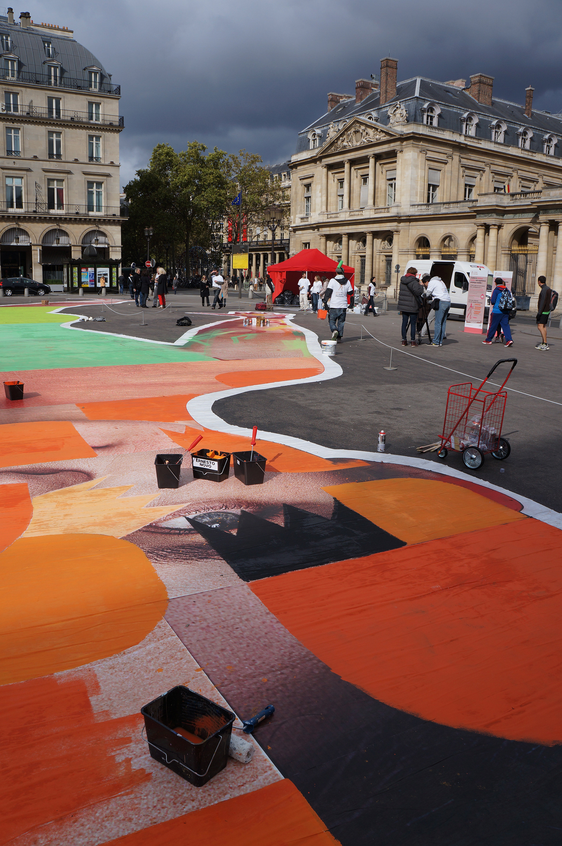 As part of a health prevention action to raise public awareness of an unknown skin disease, a giant figure stuck to the ground from 25 photographs of skin pieces was imagined and made on the Palais Royal Place in Paris. This human body of 750m2 was then customized by 7 street artists according to a chromatic code to create an artistic cartography of the sensitive areas related to the disease.