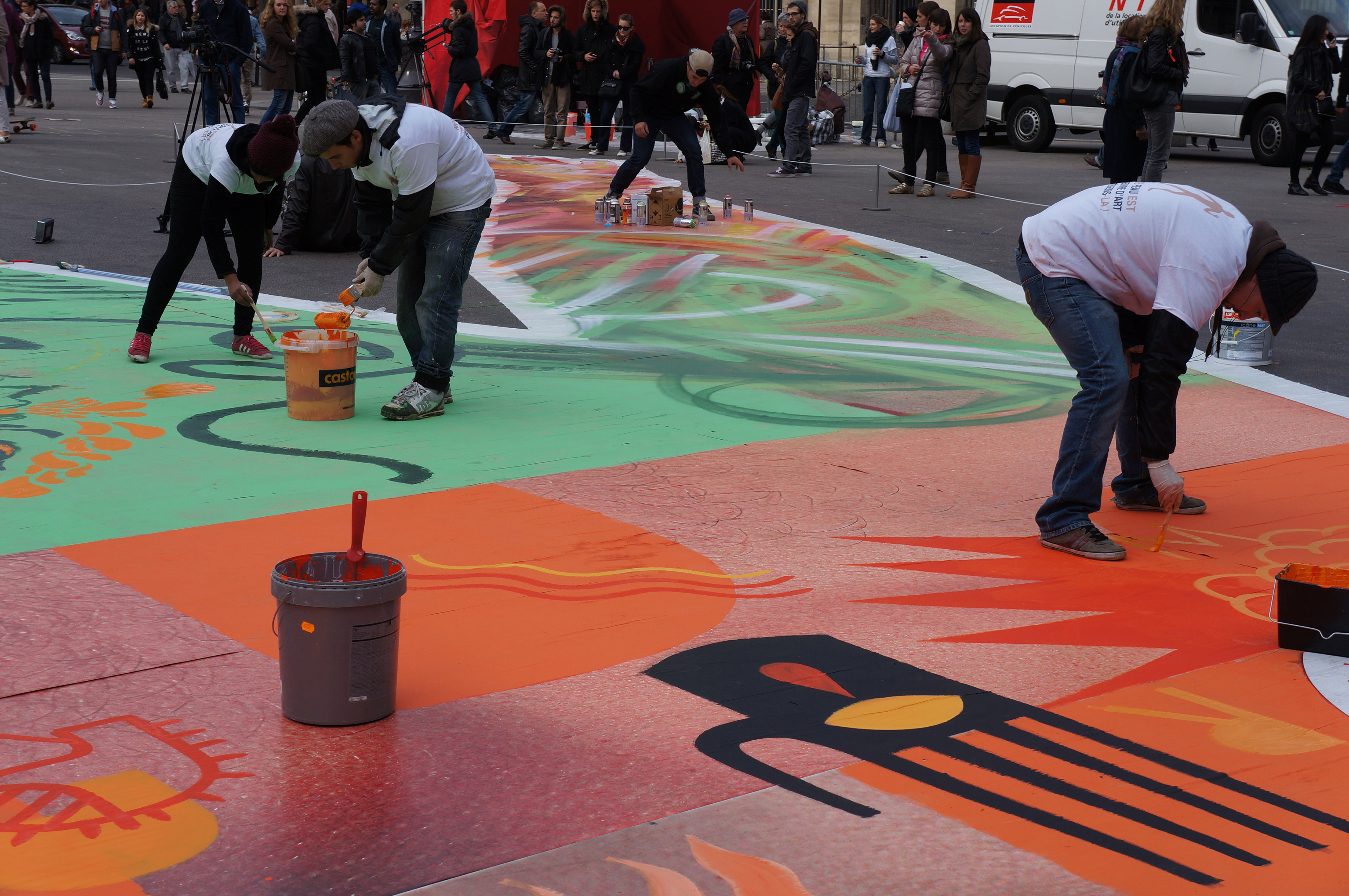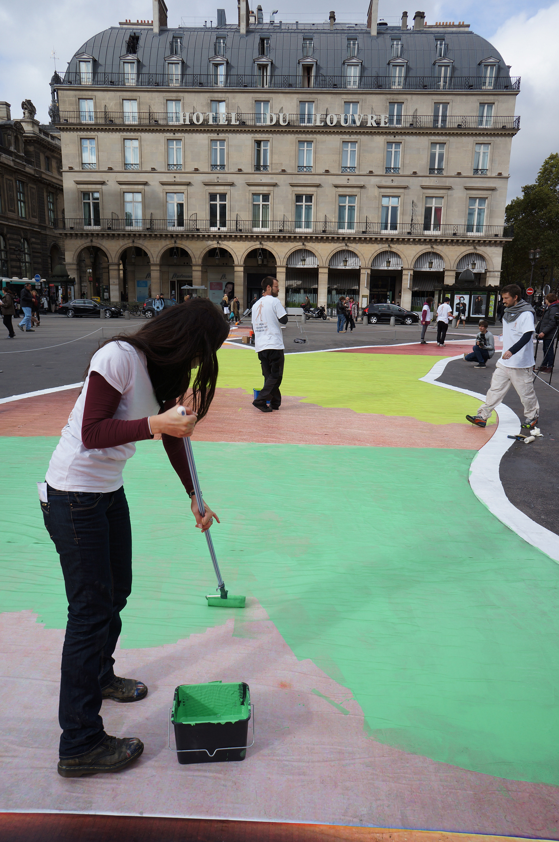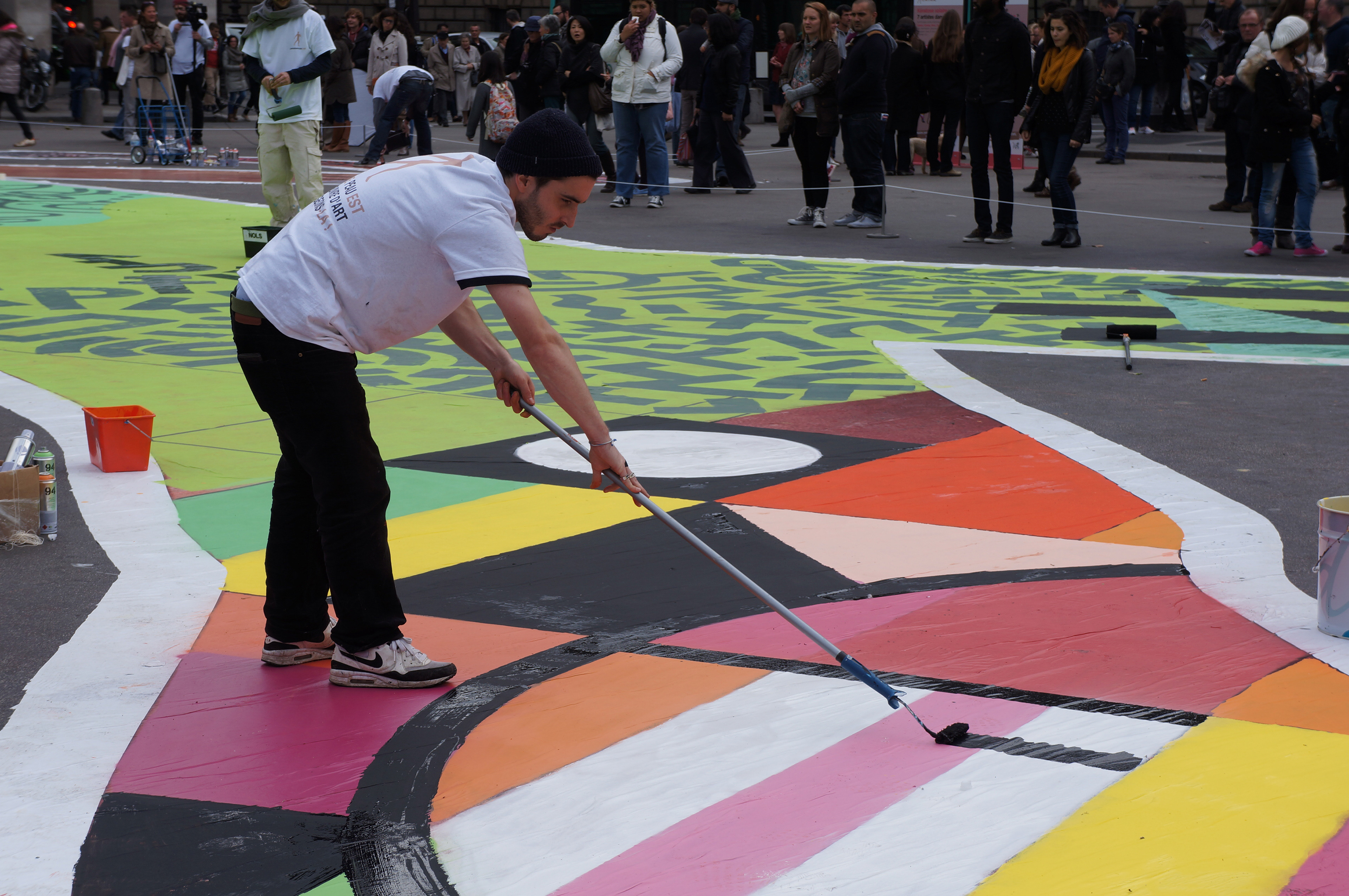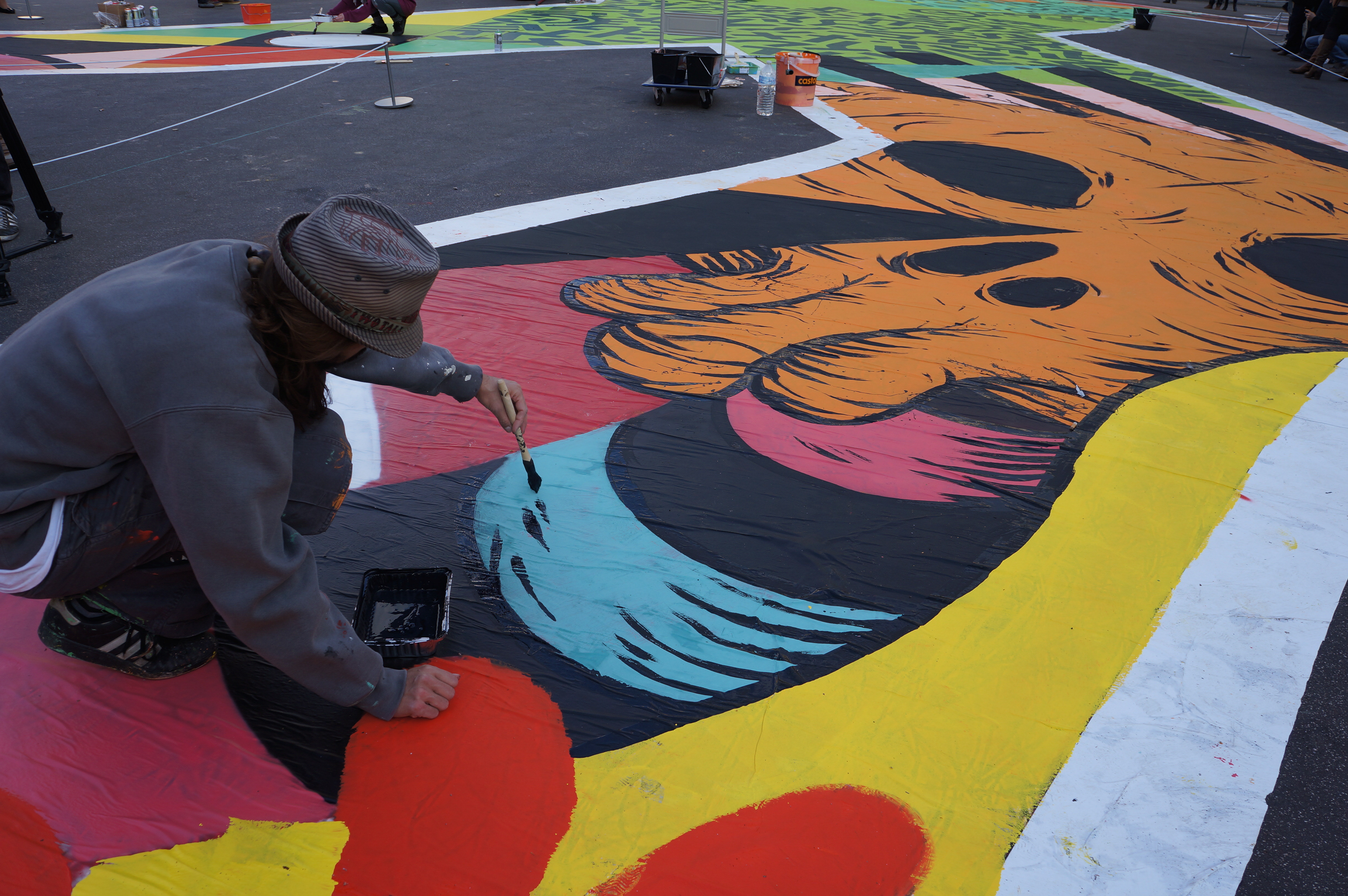 As part of a health prevention action to raise public awareness of an unknown skin disease, a giant figure stuck to the ground from 25 photographs of skin pieces was imagined and made on the Palais Royal Place in Paris. This human body of 750m2 was then customized by 7 street artists according to a chromatic code to create an artistic cartography of the sensitive areas related to the disease.