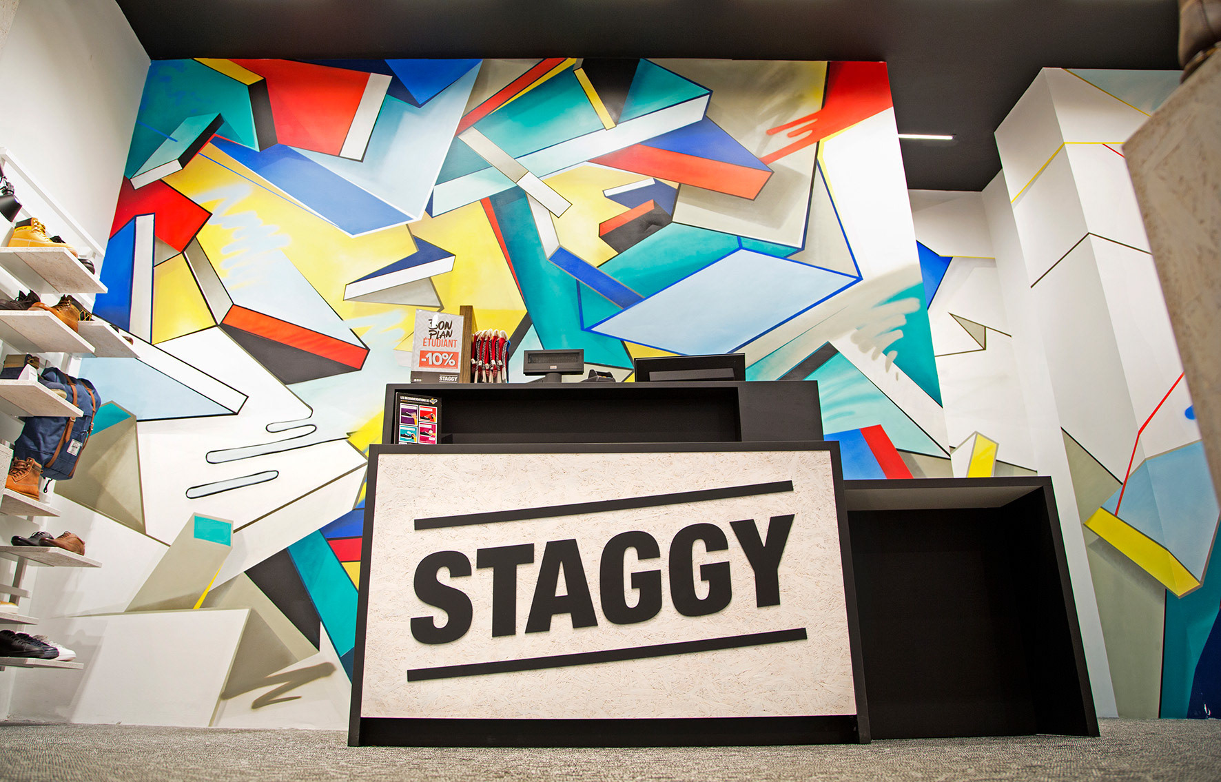 The Eram group (shoes, clothing, accessories) wants to refresh the image of its urban brand and lifestyle Staggy by infusing a unique artistic experience to its concept stores. More contemporary, bright and warm, each store is enhanced by a graphic work performed by an artist from the local urban scene.
